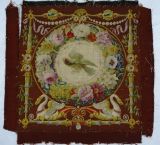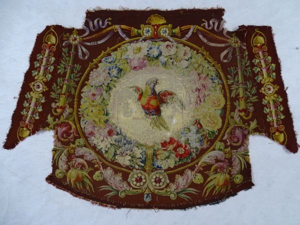 Décor : oiseau sur fond écru entouré d'une riche guirlande florale encadrée par un médaillon, dans un cadre joyaux. Contre fond marron.