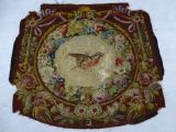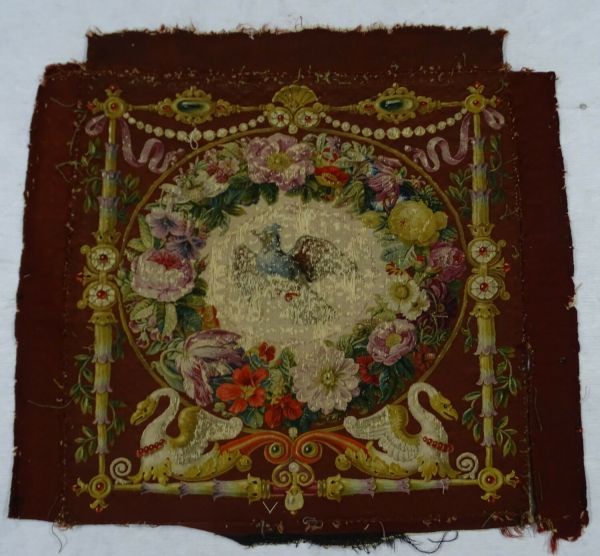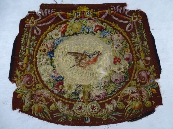 Décor : oiseau sur fond écru entouré d'une riche guirlande florale encadrée par un médaillon, dans un cadre joyaux. Contre fond marron.