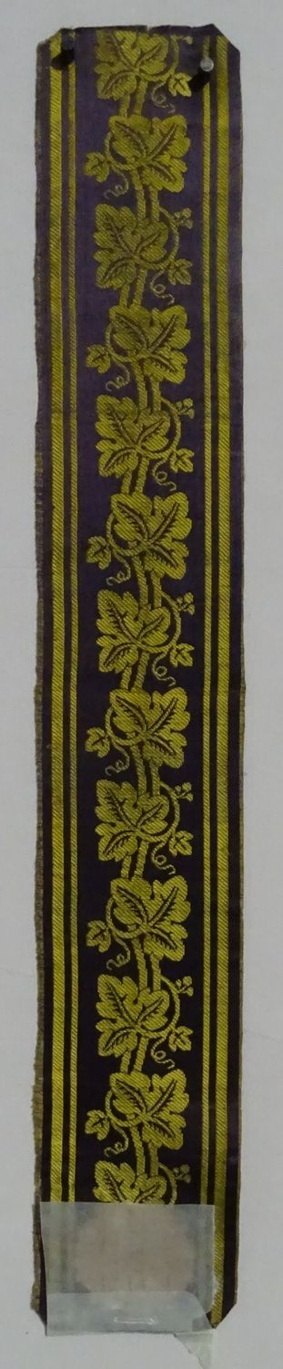 Bordure pour sièges. Damas fond satin violet liseré jaune, le dessin représente un courant de lierre.