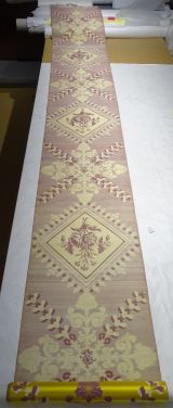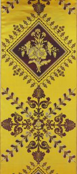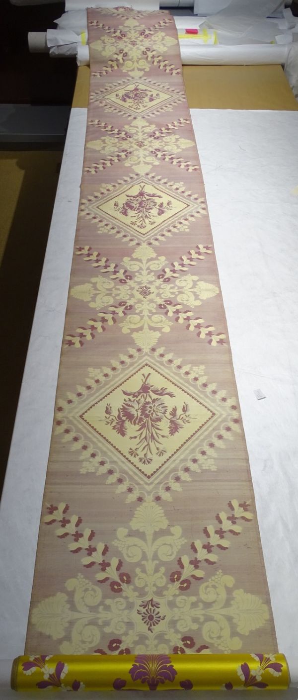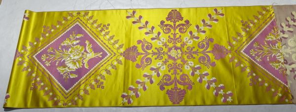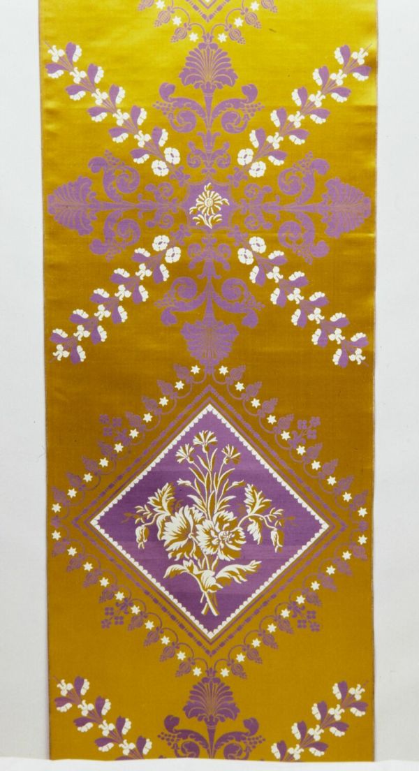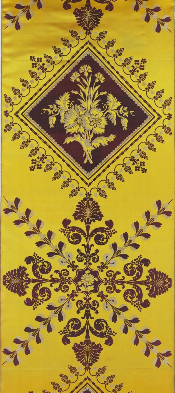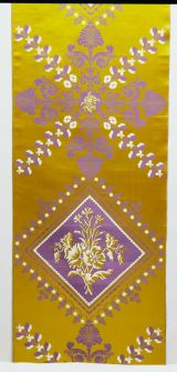 Lé de tenture en « Damas 11/24 3 couleurs Fond Satin Jaune N°3 lizeré blanc et lilas Rouge N°1 », le dessin représentant « un compartiment de Feuilles en ornements et camé contenant des Pavots ». Les compartiments sont en forme de losange bordé de guirlandes végétales avec un alternement d'étoiles. Le motif complet est une alternance entre le motif des compartiments en losange avec un motif de compartiments en étoile avec une marguerite en son centre et des ornements végétaux autour.