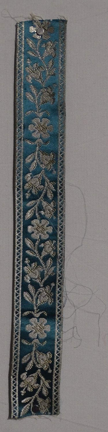 - Bordure brocart argent sur fond bleu, frise avec dessin de branches et fleurs de lys bordée par deux petites frises de motifs triangulaires.
