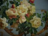 Buisson de roses jaunes sur fond gris bleuté dans un encadrement rond de feuilles d'acanthe dorées séparé d'un encadrement de même style par un fond vert d'eau, contrefond bordeaux.