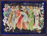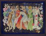 Un groupe animé de femmes, en robe de soirée aux vives couleurs, et de quelques hommes en habit, évoquent l'esprit de fête qui illumine l'entre-deux-guerres