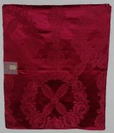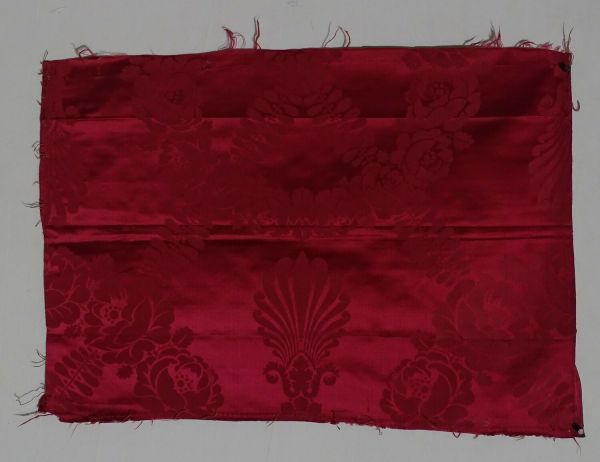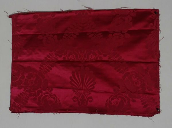 Lé pour tenture, siège ou lit en damas fond satin cramoisi fin n°3 à couronnes de roses, petites palmes et guirlandes de feuilles croisées en X.