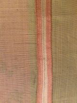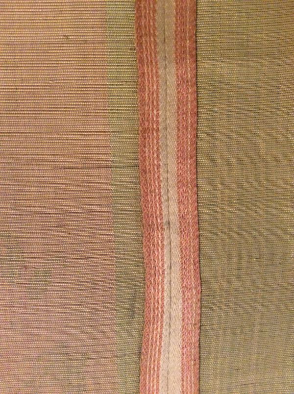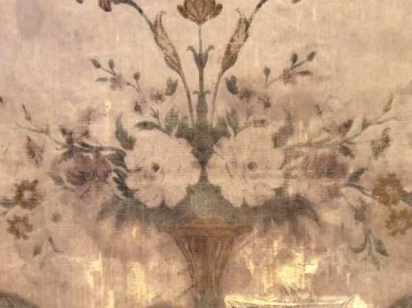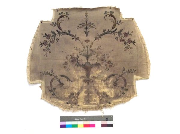 Dépècement de siège, sans doute fond de siège. La pièce est composée de trois morceaux cousus entre eux, de section carrée, arrondie sur ses bordures supérieure et inférieure. Plusieurs morceaux de lisière sont encore présents. Velours ciselé, fond satin, soie. Décor de bouquet de fleurs, roses, dans un vase et feuilles d'acanthe, organisé dans une composition symétrique.