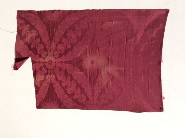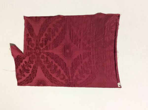 Dépècement de rideaux. Damas rouge ton sur ton, sans envers. Largeur de lé complète. Section rectangulaire. Motifs répétés dans la hauteur : soleil rayonnant entouré de guirlandes de fleurs et d'un tore de lauriers. Plis transversaux parallèles visibles sur toute la surface de la pièce. Décoloration poncutelle sur l'ensemble de la surface du textile (revers seulement) ; section en partie découpée.