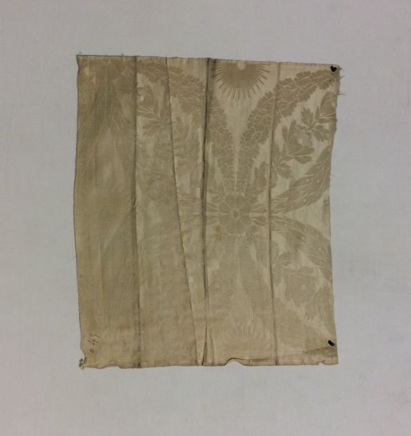 Dépècement de rideaux. Damas crème ton sur ton, sans envers. Largeur de lé complète. Section carrée. Motifs répétés dans la hauteur : soleil rayonnant entouré de guirlandes de fleurs et d'un tore de lauriers. Plis transversaux parallèles visibles sur toute la surface de la pièce.