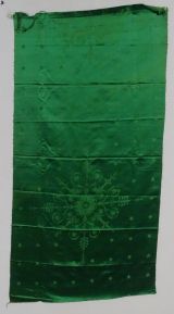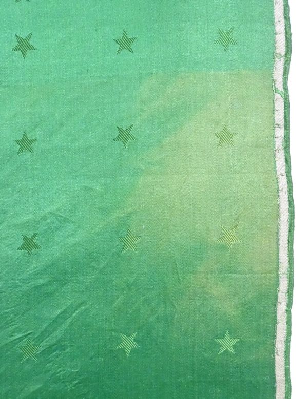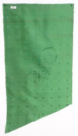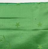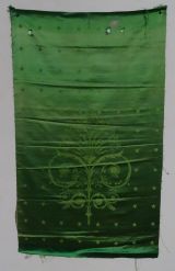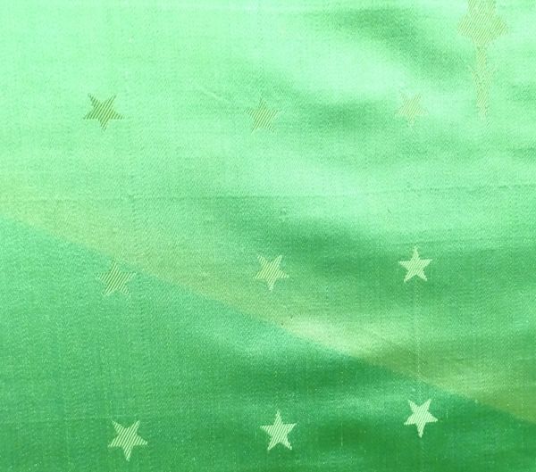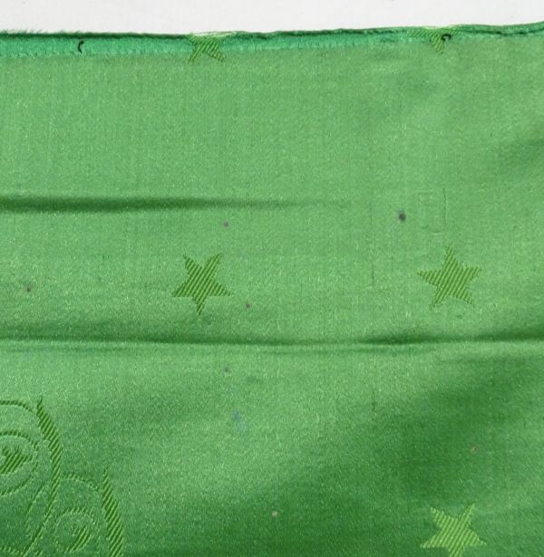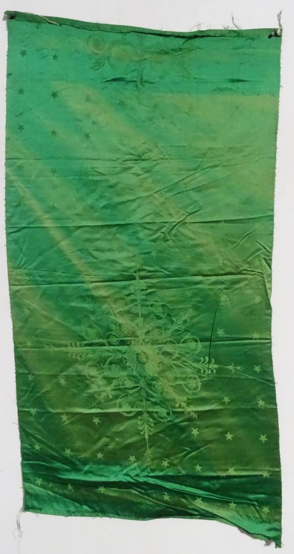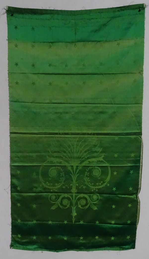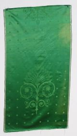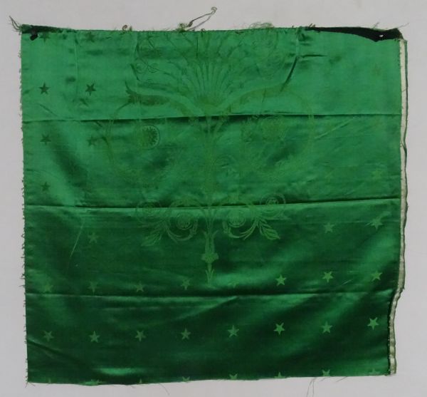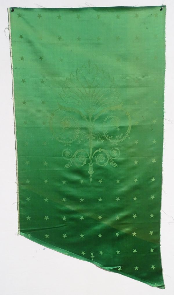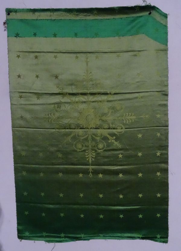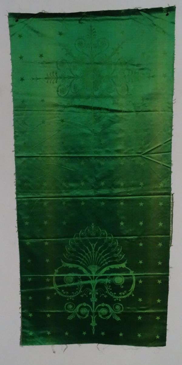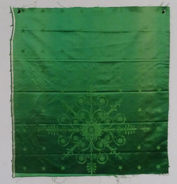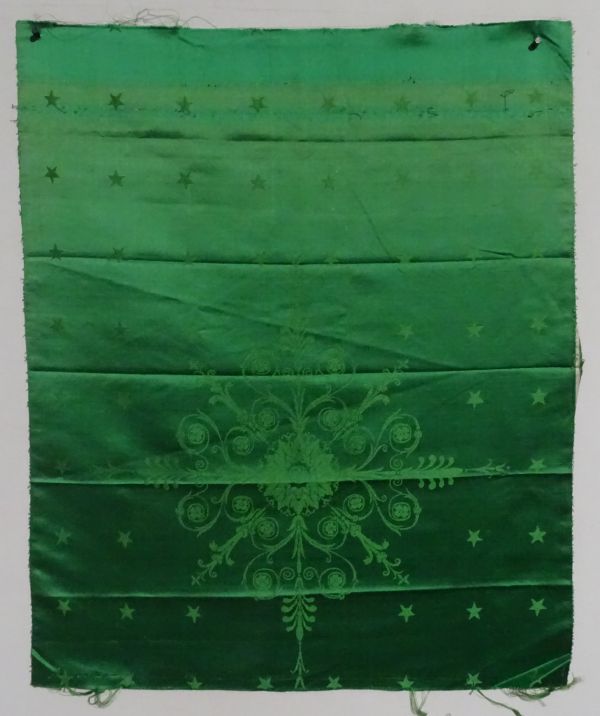 Etoffe pour sièges en damas vert ton sur ton. Le dessin représente un grand motif de palmette à enroulements et arabesques et/ou une rosace à ornements sur fond étoilé.