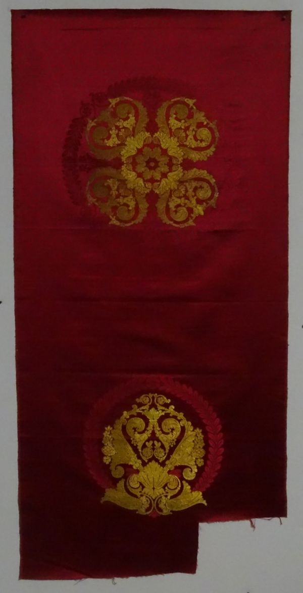 Lé de tenture pour sièges, brocart or fond satin damassé cramoisi, dessin de rosaces et ornement entourés d'une couronne de laurier.