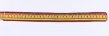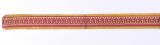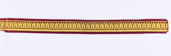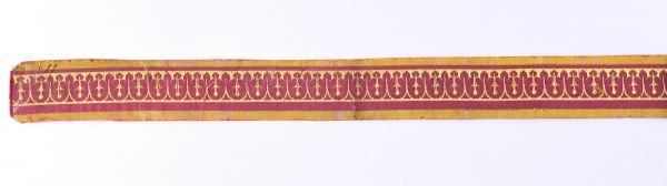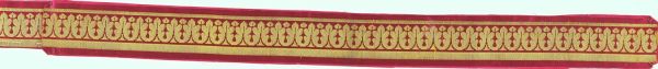 Trois bordures pour siège agrafées ou cousues ensemble grossièrement en continu, en brocart or et soie fond satin cramoisi n°4 "broché de 3 ors, filé et frisé", dessin "à rinceaux et feuilles d'acanthe, roses, écossés et rozaces".