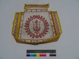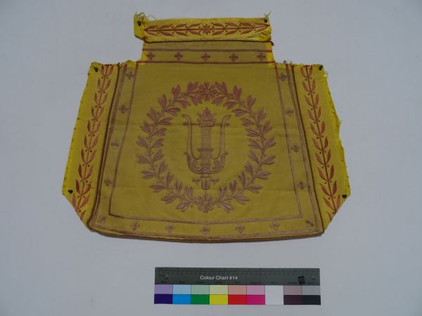 Dépècement de garniture pour siège (assise) en gros de Tours 15/16 jaune brodé au passé de soie amarante. Dessin central de lyre dans une couronne de blaches d'olivier et de fleurs, encadré par une frise de trèfles. Les bordures sont ornées d'une frise de branches d'olivier. La passementerie sur le pourtour de l'assise est encore en place.