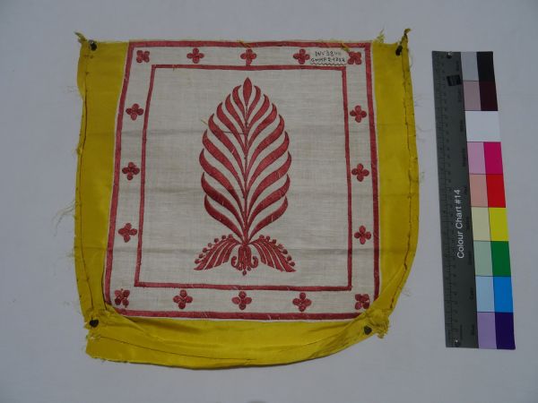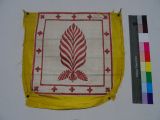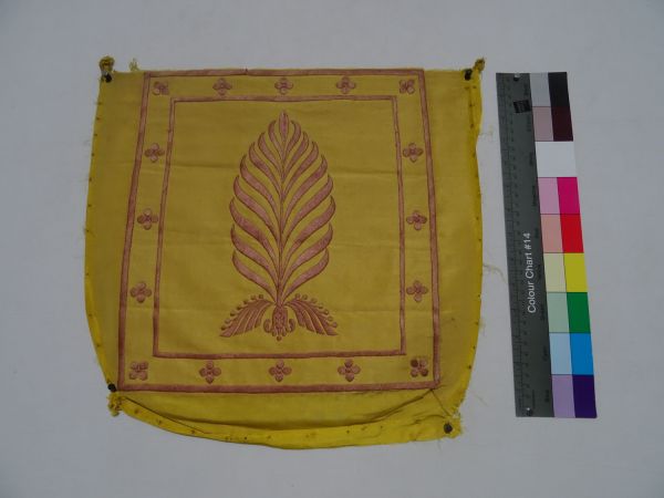 Dépècement de garniture pour siège (dossier) en gros de Tours 15/16 jaune brodé au passé de soie amarante. Dessin central de palme, encadré d'une frise de trèfles. Bordure supérieure découpée.