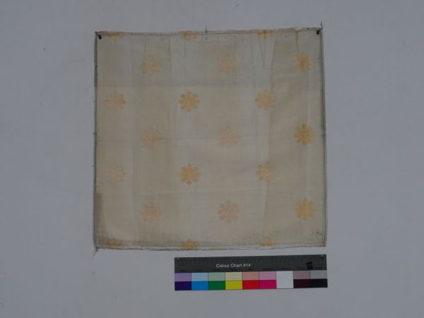 Etoffe pour tenture. Les deux lisières sont encore en place. Gros de Tours blanc broché une seule nuance couleur d'or, dessin à rosaces en quinconce. Largeur du motif : 50 mm.