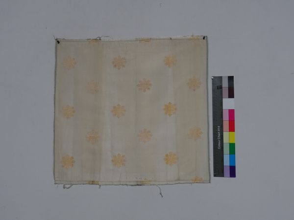 Etoffe pour tenture. Les deux lisières sont encore en place. Gros de Tours blanc broché une seule nuance couleur d'or, dessin à rosaces en quinconce. Largeur du motif : 50 mm.