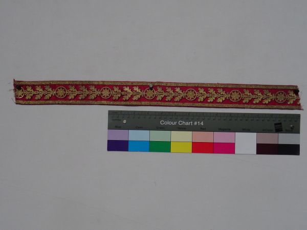 Elément de bordure de dossier de fauteuil. Les bordures longitudinales sont repliés et cousus au revers. Fil de couture rouge visible. Damas double corps fond satin cramoisi, soie et filé or. Dessin courant de branches de chêne et d'étoiles.