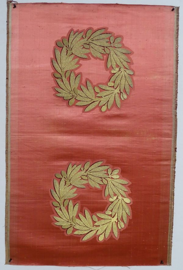 Lé de tissu avec deux écussons en brocart or à fond ponceau avec deux couronnes d'olivier.