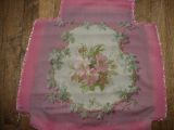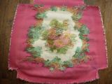 Décor floral sur fond de laine beige entouré d'une guilande de fleurs sur fond cramoisi.