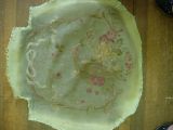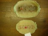 Sur un fond gris, panier de fleurs mauves, roses et blanches. Encadrement de rinceaux et acanthes, guirlande de laurier et fleurs enrubannées blanches au centre.