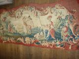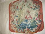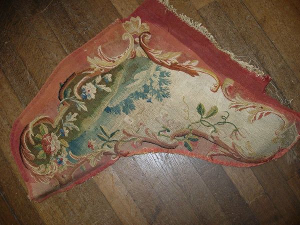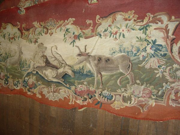 Animaux sur le fond, bergers et bergères sur le dossier. Rinceaux et guirlandes de fleurs sur contrefond marron. "Fables de la Fontaine".