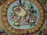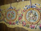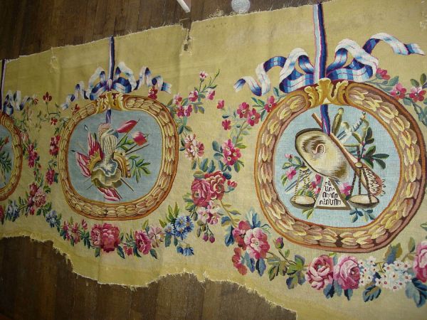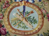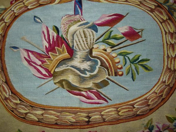 3 médaillons (décor casque et armes) sur fond de laine jaune. Guirlande de fleurs et rubans.