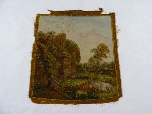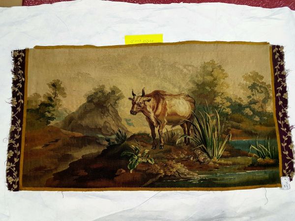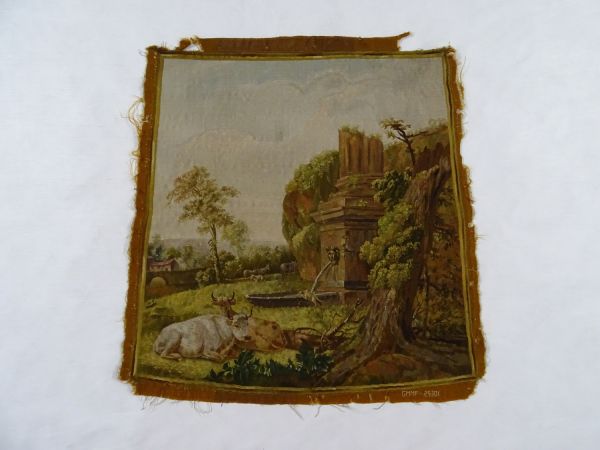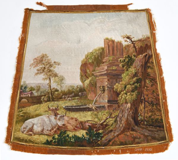 Décor : paysage champêtre avec ruines de piédestal et colonne. Deux vaches allongées au premier plan, derrière - une fontaine sur piédestal et chien buvant, village et animaux à l'arrière plan. Listel marron plusieurs tons, contrefond marron.