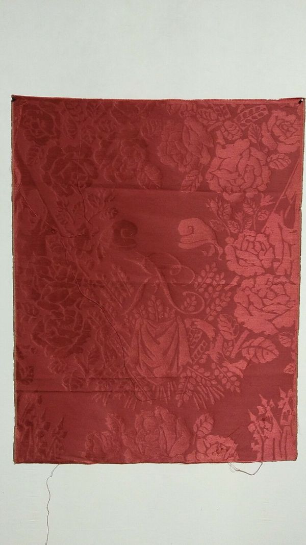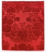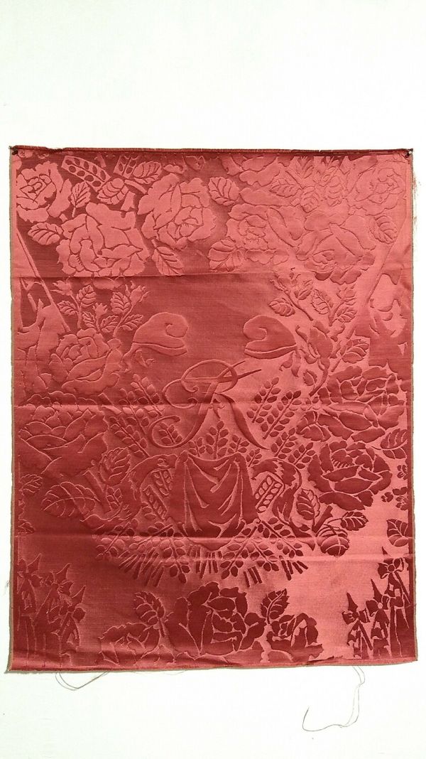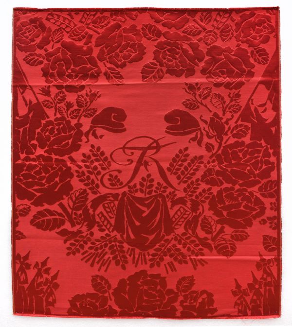 Lé de brocatelle de soie cramoisi. Un RF est représenté au centre de la pièce flanqué de deux bonnets phrygiens et surplombant un drapé d'où semblent émerger des épis de blé. Ces éléments décoratifs sont cernés par une couronne de roses épanouies, de feuilles de rosiers et de boutons de roses. Deux drapeaux sur leur hampe divergent de part et d'autre. En dessous, une couronne de rose semblable occupe la partie centrale cernée par les terminaisons des hampes des drapeaux qui doivent permettre le raccord du dessin entre les lés.