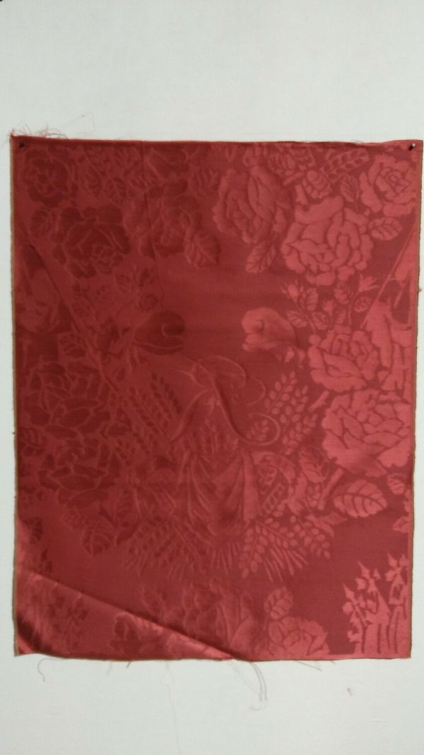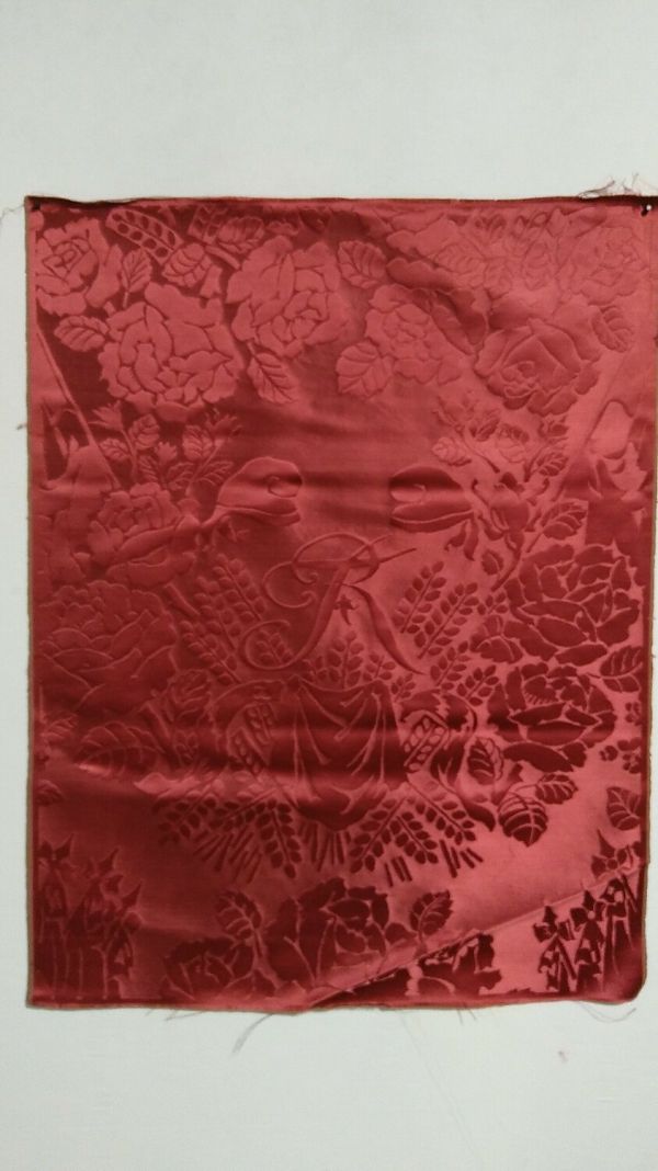 Demi-lé de brocatelle de soie cramoisi. Un RF est représenté au centre de la pièce flanqué de deux bonnets phrygiens et surplombant un drapé d'où semblent émerger des épis de blé. Ces éléments décoratifs sont cernés par une couronne de roses épanouies, de feuilles de rosiers et de boutons de roses. Deux drapeaux sur leur hampe divergent de part et d'autre. Il manque la partie inférieure du rapport de dessin. Deux lisières.