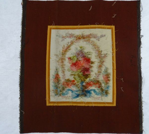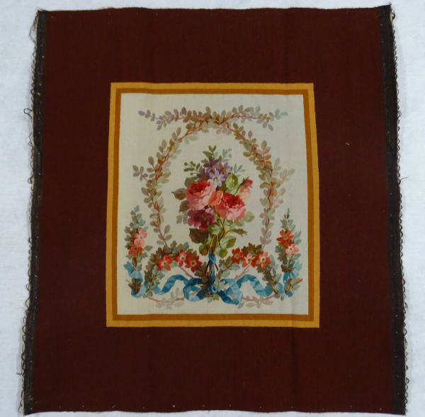 Décor : couronne de petits feuillages tenue par un ruban bleu tenant des guirlandes et des bouquets de fleurs sur un fond rectangulaire blanc. Double listel jaune. Contrefond marron.