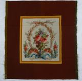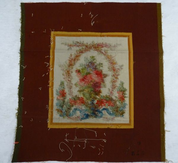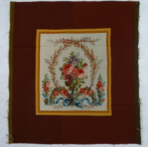 Décor : couronne de petits feuillages tenue par un ruban bleu tenant des guirlandes et des bouquets de fleurs sur un fond rectangulaire blanc. Double listel jaune. Contrefond marron.