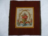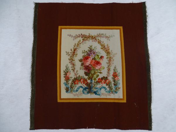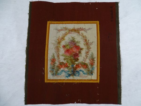 Décor : couronne de petits feuillages tenue par un ruban bleu tenant des guirlandes et des bouquets de fleurs sur un fond rectangulaire blanc. Double listel jaune. Contrefond marron.