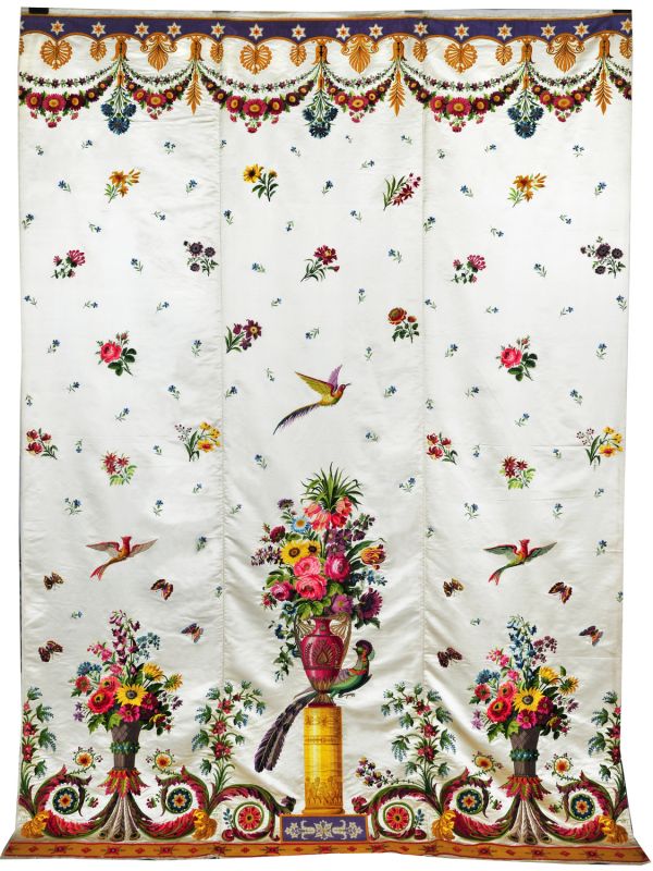 Tenture en trois lés de satin blanc brodé, en soie et chenille avec applications de taffetas couleur d'or. Dessin d'oiseaux, semé de fleurs, corbeilles et vases en partie basse.