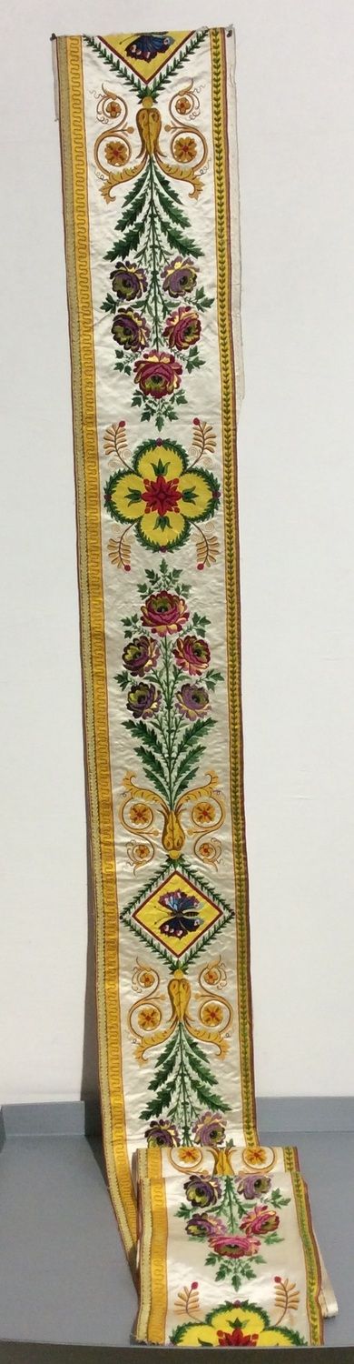Satin blanc "brodé en soie et dorure très précieusement", dessin de branche de roses, culots et enroulements, camées en losange ou en quadrilobes sur fond taffetas couleur d'or avec papillon et fleur impériale brodés au centre.