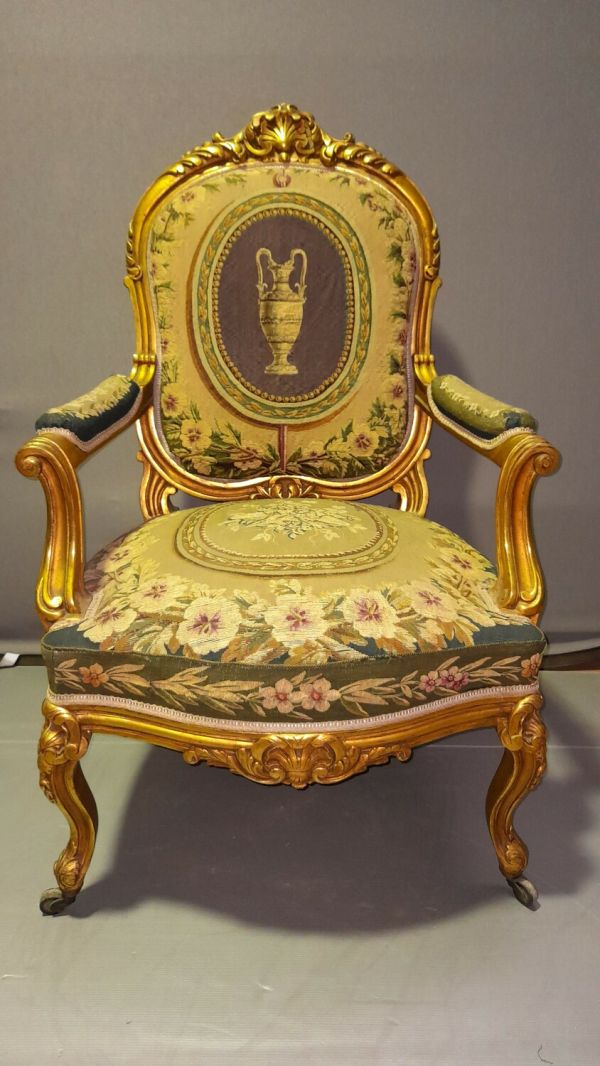 Fauteuil à la reine de style Louis XVI, bois doré, coquille sur les écoinçons des pieds, coquille sculptée avec des rinceaux sur la ceinture, et coquille sculptée avec rinceaux et feuilles d’acanthe sur le cintre. Accotoirs à manchettes. Dossier tapisserie guirlande de fleurs et médaillon avec amphore. Assise tapisserie guirlande de fleurs avec médaillon et au centre un arrangement floral. Pieds antérieurs à roulettes.