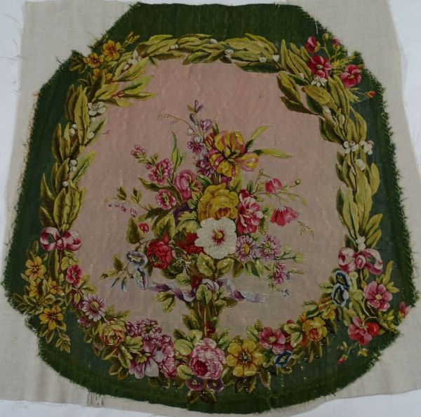 Décor : grand bouquet de fleurs sur fond rose, contour à guirlandes avec fleurs et feuilles de laurier, contrefond vert.