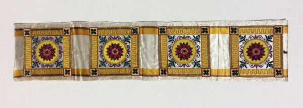 Ecussons pour angle de rideaux en satin blanc brodé en soie et chenille à dessin de fleur dans un camée en taffetas couleur or.