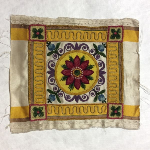 Ecussons pour angle de rideaux en satin blanc brodé en soie et chenille à dessin de fleur dans un camée en taffetas couleur or.