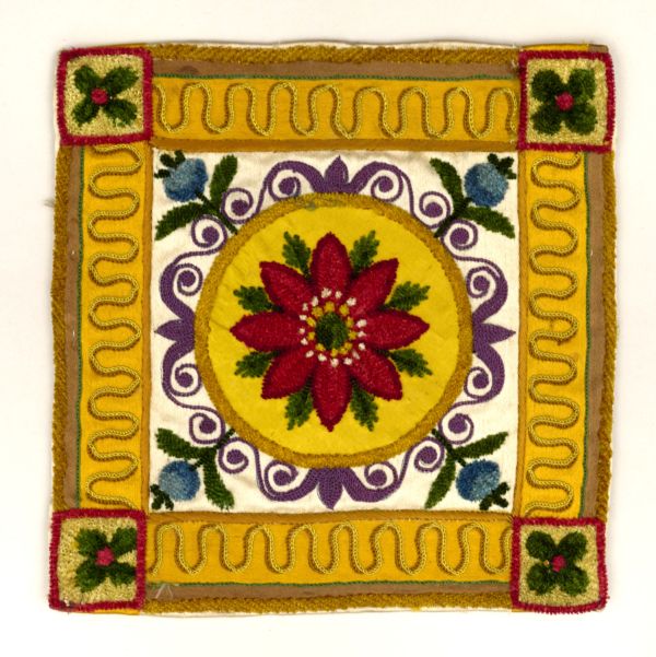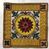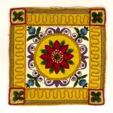 Ecussons pour angle de rideaux en satin blanc brodé en soie et chenille à dessin de fleur dans un camée en taffetas couleur or.