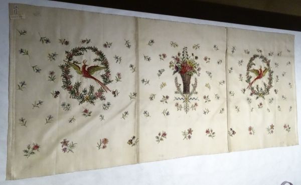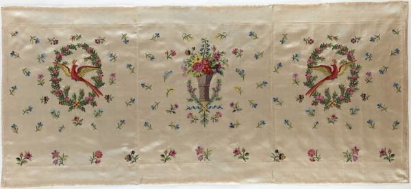 Satin uni fond blanc qualité forte, brodé en soie et chenille et filés d'or. Dessin en trois lés : au centre une corbeille de fleurs; de part et d'autre, un oiseau dans une couronne de fleurs, le fond semé de 85 bouquets détachés..