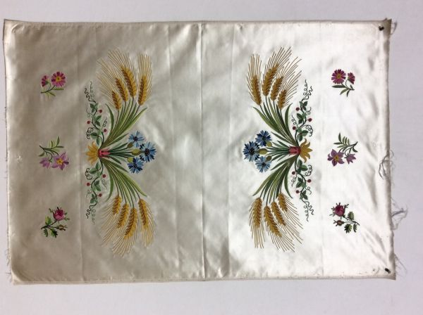 Joue de canapé. Satin blanc à décor brodé en soie et chenille d'un bouquet de bleuets central duquel jaillissent de part et d'autre deux gerbes de blé latérales. Des pampres végétales s'enroulent à la base du bouquet. Sous ce décor principal s'épanouissent 2 petites fleurettes. Le décor se répète x1 dans la hauteur mais de manière affrontée [en miroir]. Des plis transversaux sont à noter.
