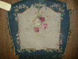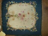 Canapé, dossier (0.53 x 1.40m) : sur un fond crème se détache un bouquet de fleurs. Encadrement de légers rinceaux piqués de fleurettes sur fond vert foncé.