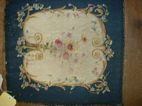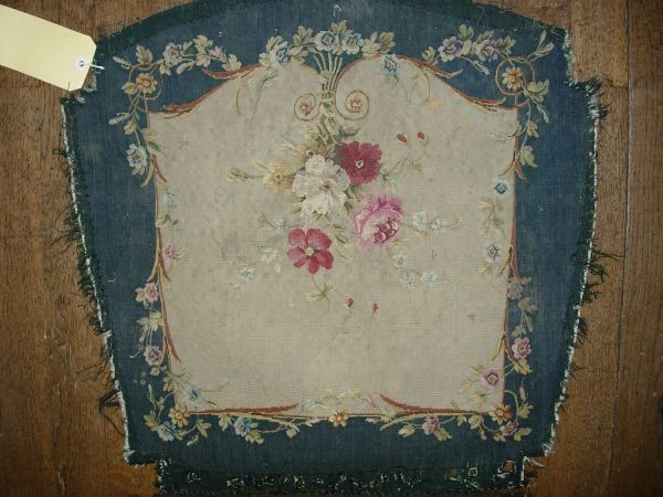 Fauteuils, assises (0.395 x 0.53m) et dossiers (0.375 x 0.36m) : sur un fond crème se détache un petit bouquet de fleurs porté par de légers rinceaux, de petits culots piqués de fleurettes formant encadrement. Fond vert foncé. 1 plate bande décorée attachée et 1 galon. 4 plates bandes unies attachées.