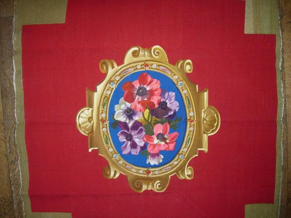 Un cartouche est formé d'un cuir découpé or à bord interne ovale, garni de cabochons. Le médaillon intérieur bleu roi est orné d'anémones, le tout se découpant sur fond cramoisi.