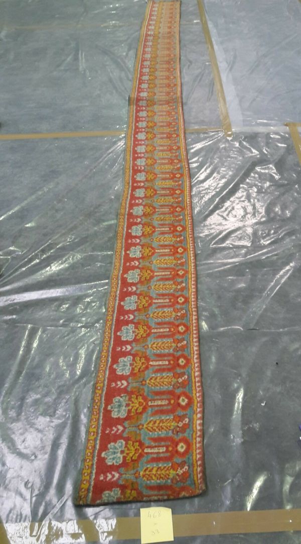 Dessin oriental, fond turquoise et rouge, motifs rouges, verts, turquoise, orange, jaune, vieux rose et blanc.
