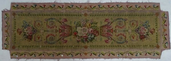 D'un meuble à dehors violet, fond jaune et décor de bouquets et corbeilles de fleurs, composé d'éléments pour canapé, fauteuil, chaises, pliant, écran et paravent tissé un première fois à Beauvais, sur des cartons du peintre Laurent et sans destination précise, entre 1817 et 1826 ; une seconde fois en 1817-1818 pour le salon des Nobles de la duchesse d'Angoulême aux Tuileries (voir l'écran C 272) ; une 3e fois entre 1820 et 1827 ; une 4e fois, avec un dehors jaune, entre 1819 et 1825 et une dernière fois en 1835.