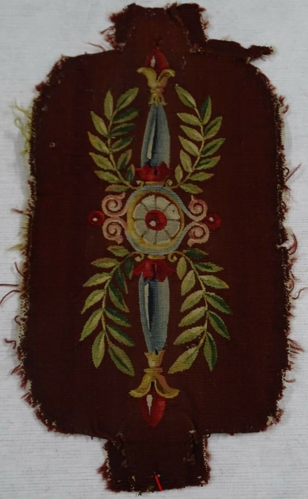 + 6 pièces de tapisserie sans numéro d'inventaire, aux motifs identiques. Semblent être des dossiers dont le centre aurait été découpé.