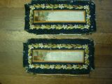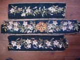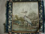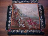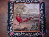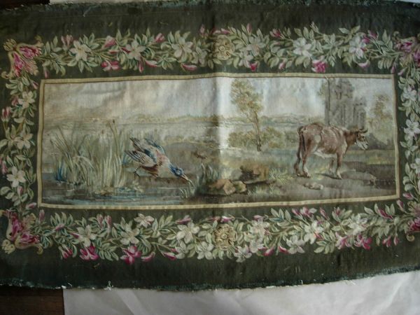 Scènes champêtres avec animaux et oiseaux. Bordures de fleurs sur fond de laine verte.