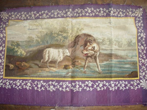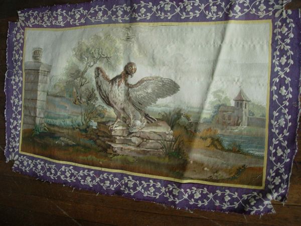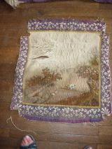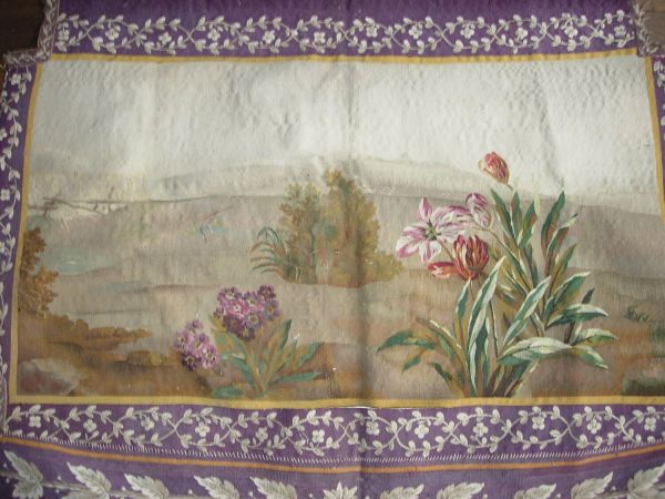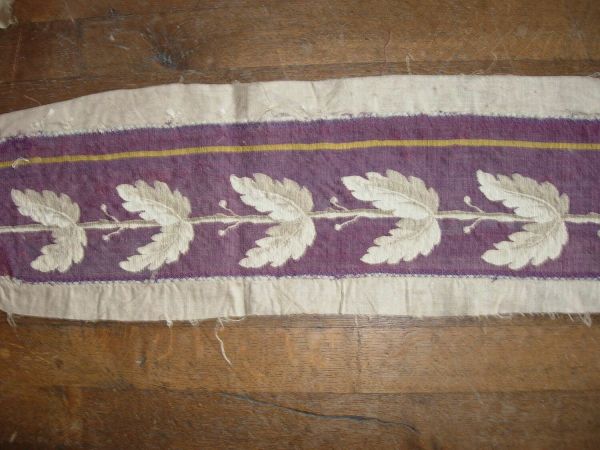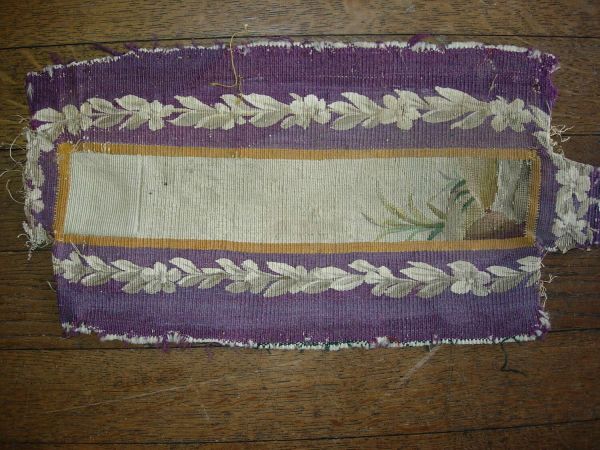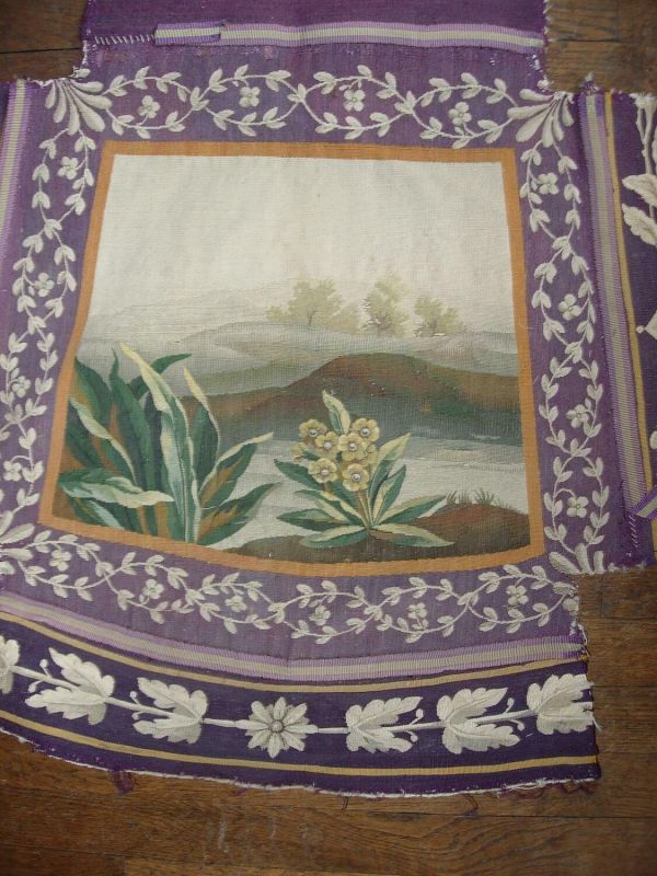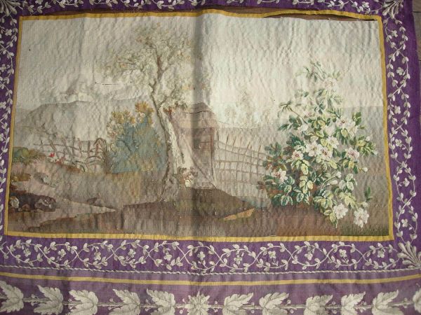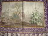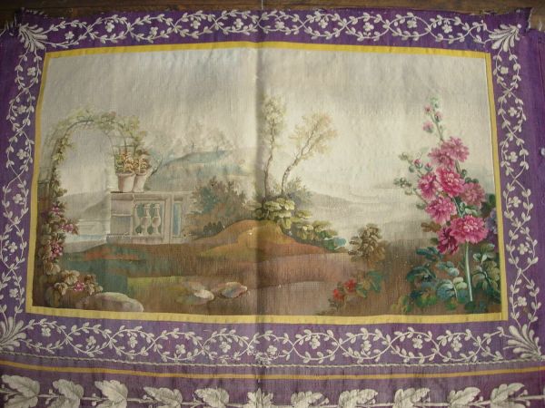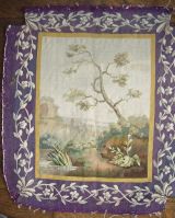 Trapèze blanc et fond de paysage. Listel jaune. Contrefond lilas. Entrelacs de feuillages blancs.