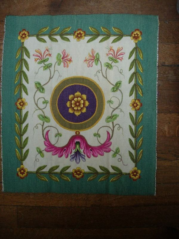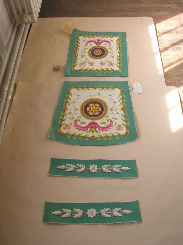 6 garnitures de chaises. Motif central: rosace or et grenat dans un médaillon mauve entouré d'un triple cercle or, vert et or, se détachant sur un fond blanc avec culot rose, vert et mauve d'où partnet deux branches de feuillage terminées par deux fleurs. Encadrement rectiligne de rosaces or et feuillage. Conterfon vert. marque au pochoir au dos: 436, 6 à l'envers, à l'angle su^érieur gauche.