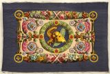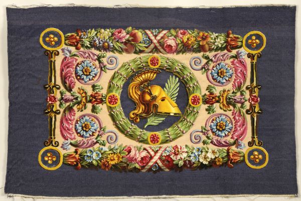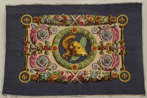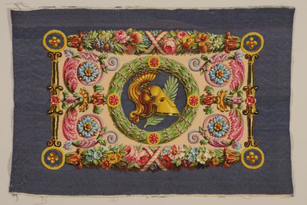 Décor : Casque doré à cimier et branche de palmier dans un médaillon rond à fond violet et encadrement en tore végétal ponctué de rosettes rouges. De part et d'autre de ce médaillon central le décor se développe en volutes en feuilles d'acanthe coloriés sur fond chamois. Encadrement de culots dorés et épaisses guirlandes florales, contrefond violet.