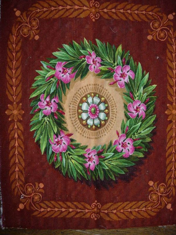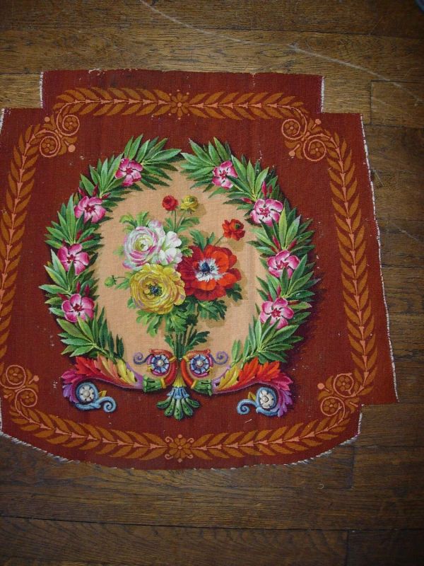 - Garniture de chaise (fond ert dossier) à centre beige orné d'un bouquet de fleurs entouré d'une couronne de feuillages et fleurs partant d'une double crossette et sur fond brun rouille. Encadrement rectangulaire de petits feuillages symétriques jaunes.
